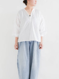 首周りはスキッパーのようにすっきりと開いたVネック。衿ぐりやカフス、肩まわりに丁寧にギャザーを入れ、ふわりと軽やかなシルエットが可愛らしいです。