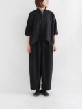 後ろのウエストにはゴムが通り、心地よくフィットするサイズ感。サイドにボタンとジップが脱ぎ履きしやすい仕様です。ゆったりとした股上で、たまごのような丸みのあるライン。生地の落ち感により膨らみすぎず収まりが良く、きれいなワイドシルエットでご着用いただけます。