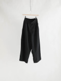 後ろのウエストにはゴムが通り、心地よくフィットするサイズ感。サイドにボタンとジップが脱ぎ履きしやすい仕様です。ゆったりとした股上で、たまごのような丸みのあるライン。生地の落ち感により膨らみすぎず収まりが良く、きれいなワイドシルエットでご着用いただけます。