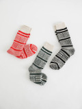 ジャカード編みで表現する総柄のソックス。柄の編み方や組み合わせ方によって、心地よく履けるようなフィット感に。裏返しても糸端が出ないよう内側もきれいに整え履き心地にこだわって作られています。