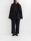 腰回りをゆったりとさせ、テーパードのかかったきれいなシルエット。ウエストは総ゴムで楽に履けて、ベルトループも付いています。ウールの落ち感によるドレープも美しく、ジャケットやニットといった秋冬アイテムにしっくり馴染みます。