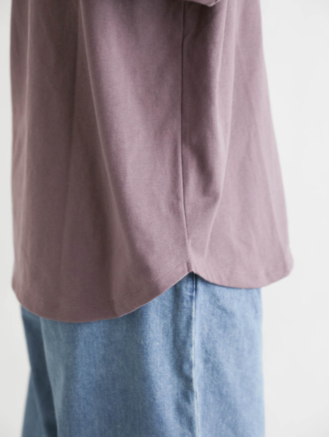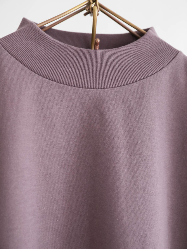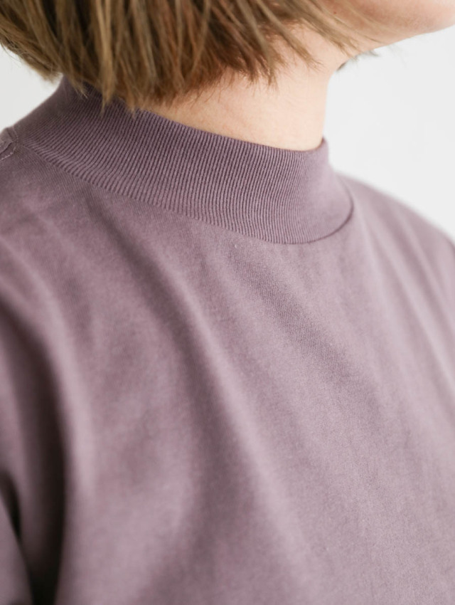 ラウンドした裾のラインがいいシルエットを作り出す、1枚で見栄えの良いミドルネックTシャツです。