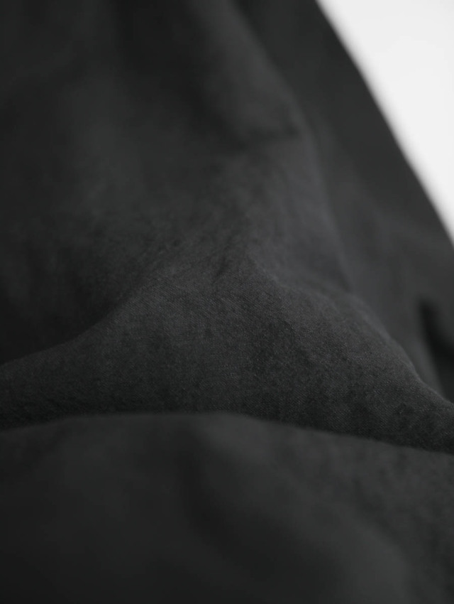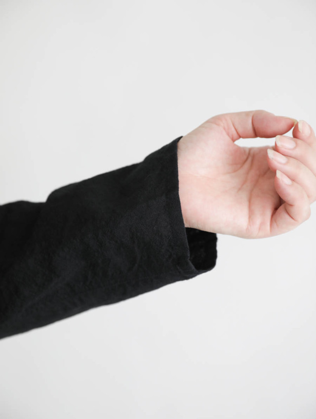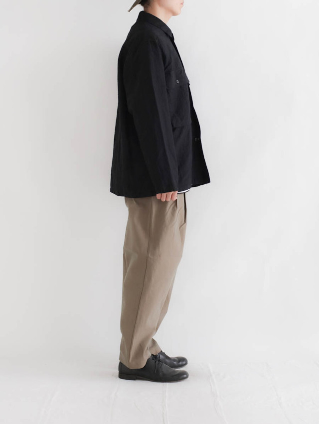上品な光沢を持ち、薄手でサラッと着れるウールリネン縮絨。スーツやドレスに使われるような上質な生地に縮絨をかけることで、立体感や奥行きのある表情に。ほんのりとしたぬくもりがあり軽やかで、3シーズン長くご着用いただけます。裏地には肌触りの良いコットンを使用しています。