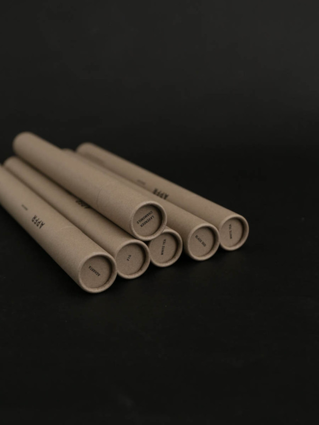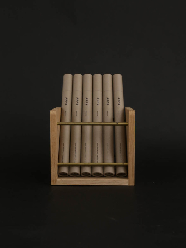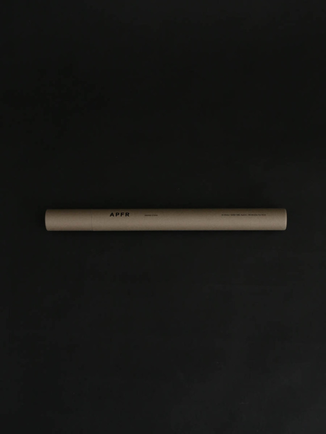 容器にもこだわるAPFR。マットなグレーの紙容器は、シックで都会的な印象。贈り物としてもおすすめなアイテムで、香りの名称はフタ上に刻まれています。お香を湿気から守るため、中にはフィルムで包んで入っています。