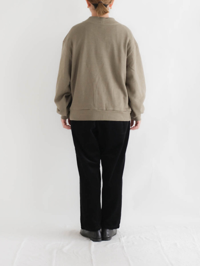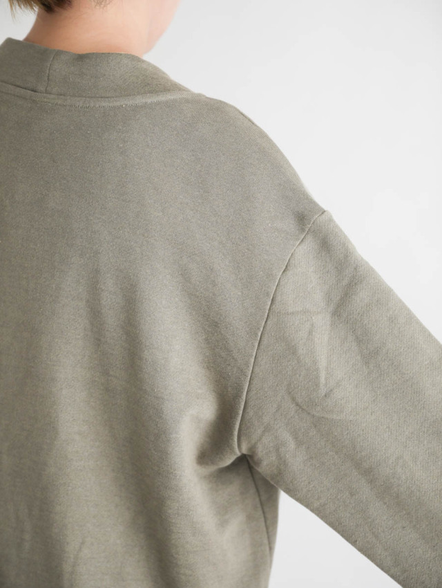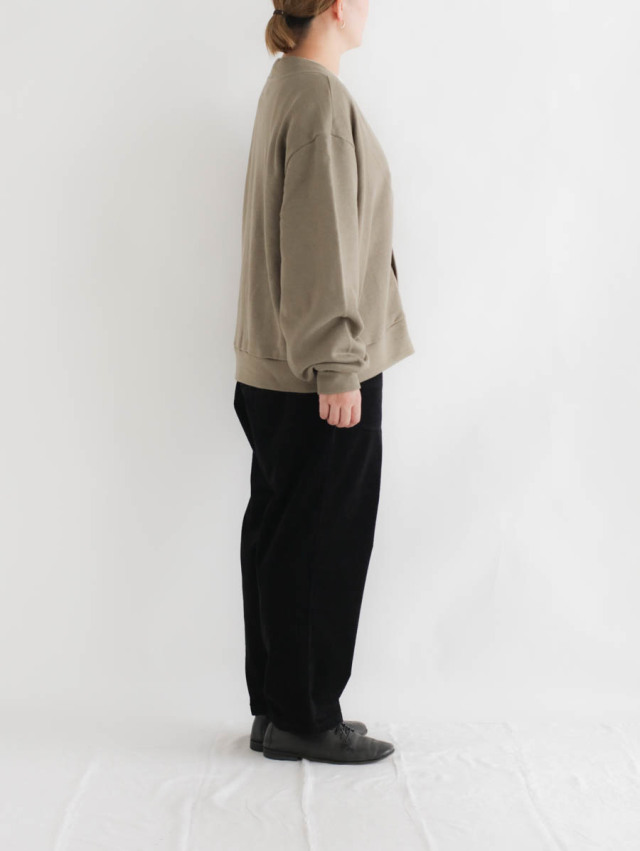 リネンの程よい光沢でラフになりすぎない綿麻裏毛。くったりと柔らかく、少し軽さのある心地よい着心地。落ち感のある生地は体に優しく馴染みます。
