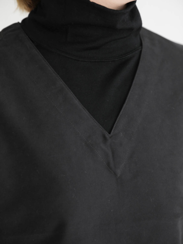 きれいなVネックが襟周りをきれいに見せてくれるので、ハイネックやフリルカラーシャツと合わせていただくのもいいですね。