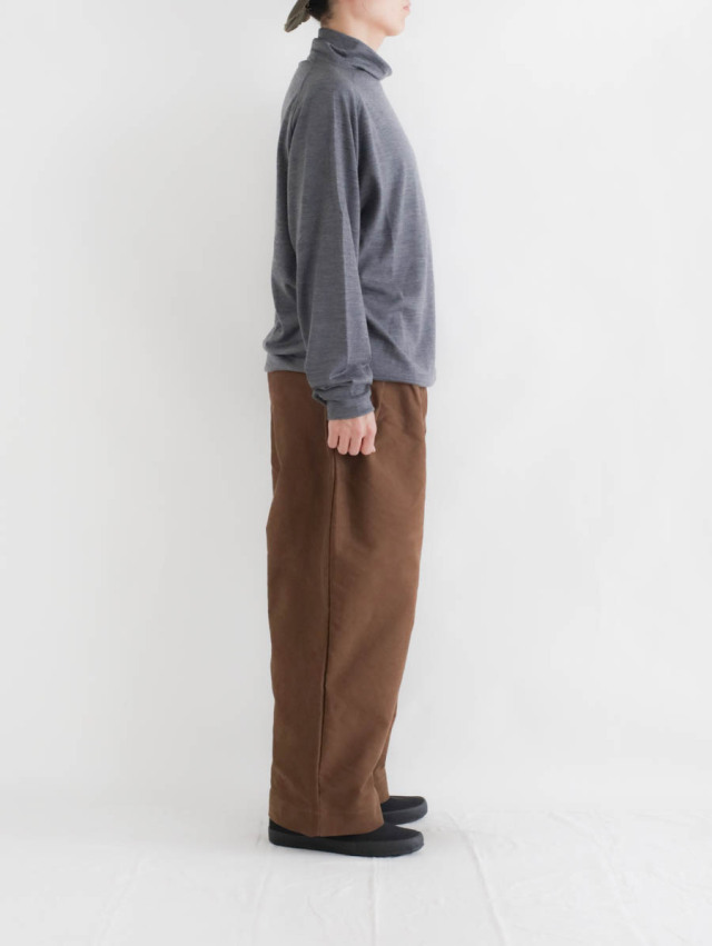 しっかりとハリのあるモールスキンを使用した、立体感のあるシルエットのワイドパンツです。