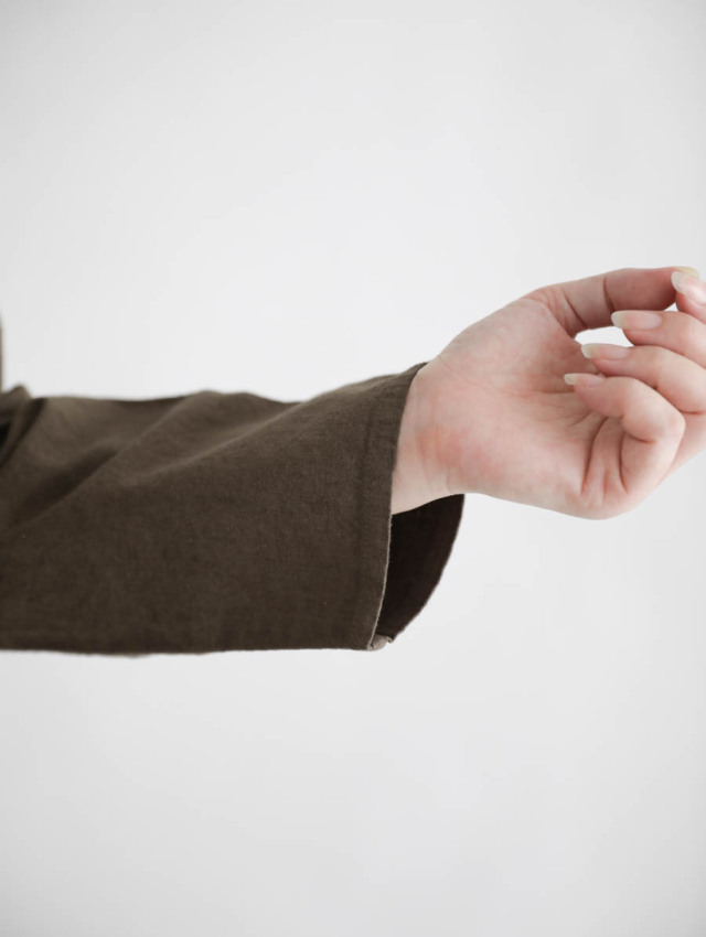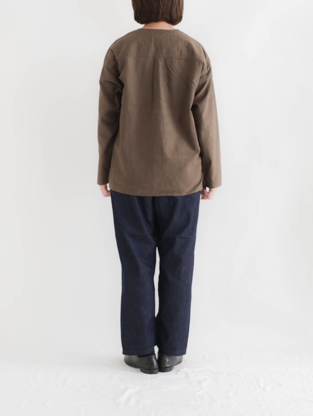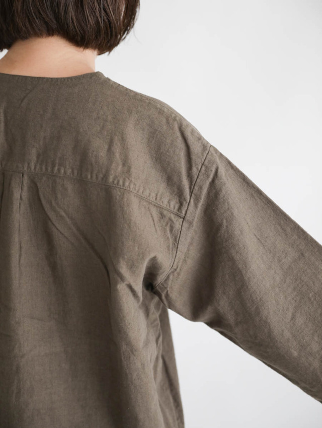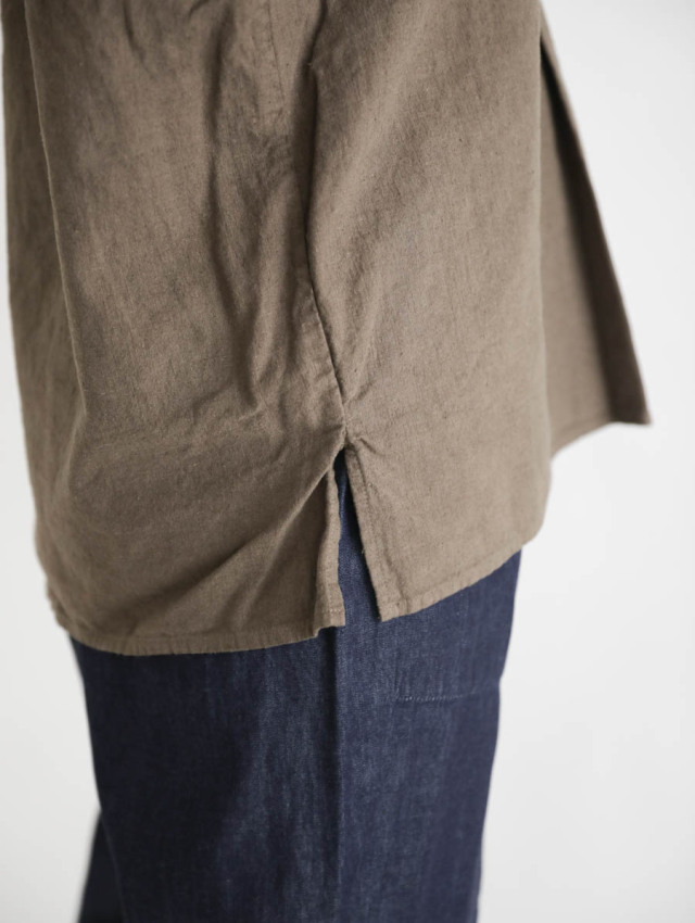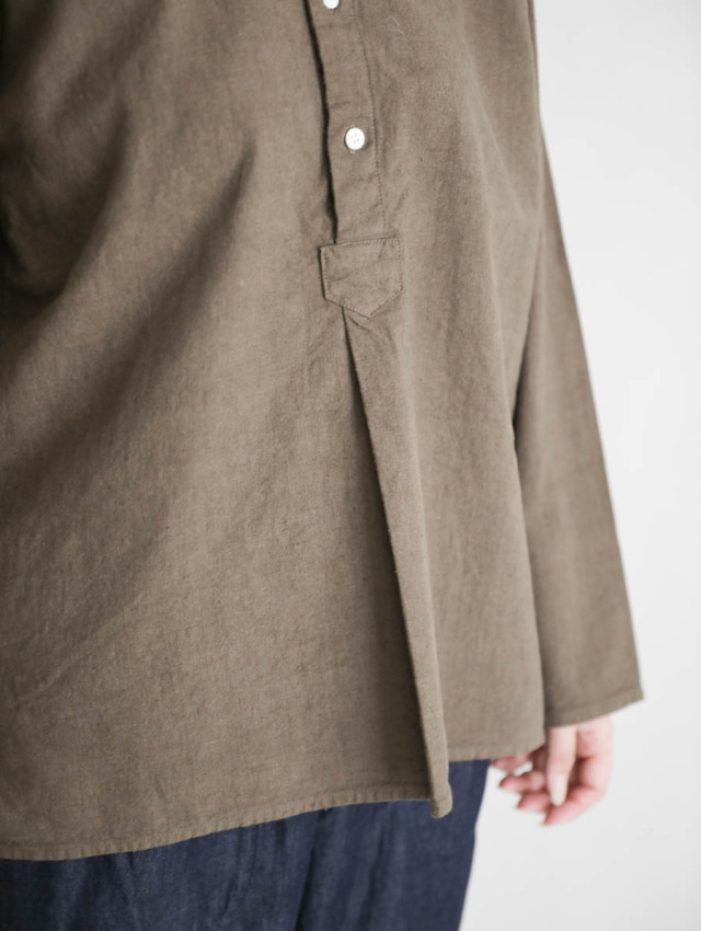 身幅、肩幅の広い、ゆったりとしたシルエットのプルオーバーシャツ。首周りをスッキリときれいに見せてくれるネックラインが特徴的。ヨーロッパのスリーピングシャツのような首元のデザインが特徴的です。
