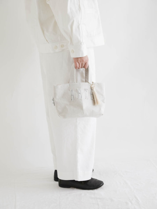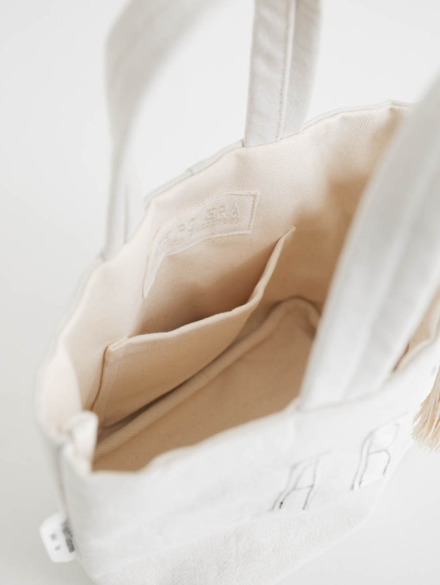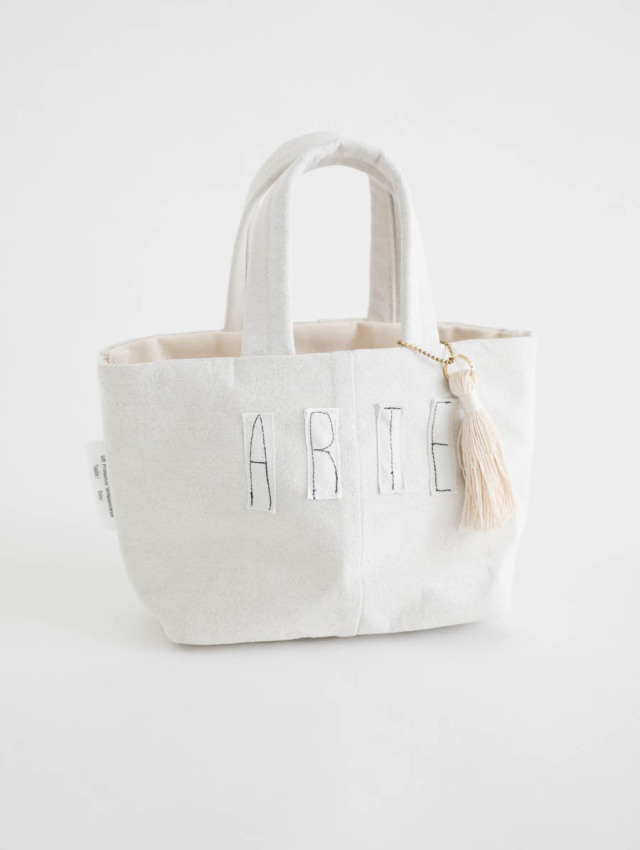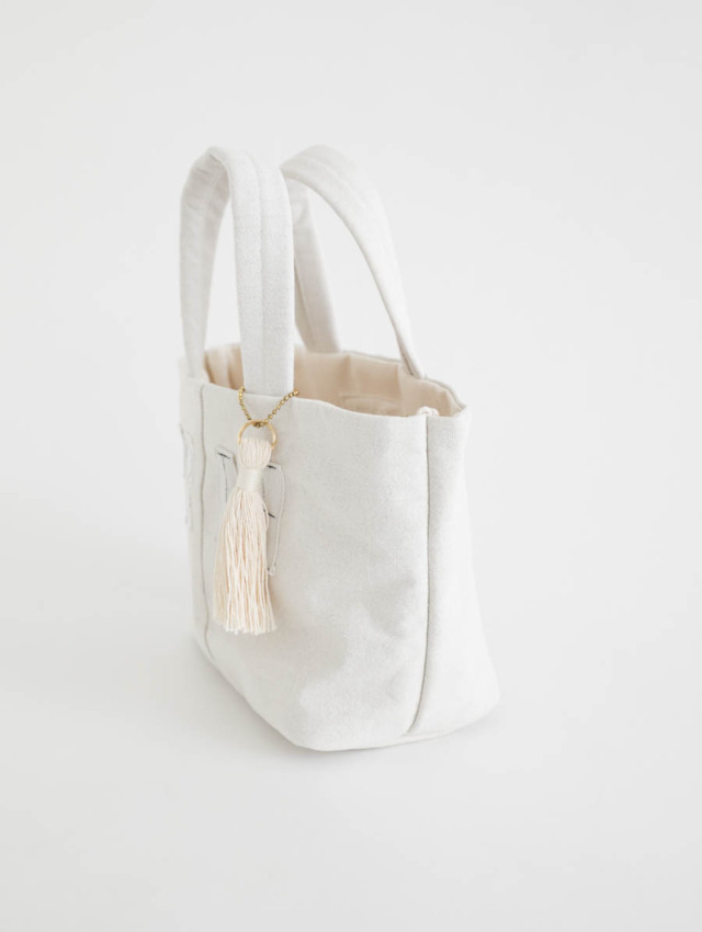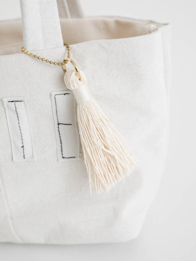 ステッチによる文字や手作りの綿糸タッセルがアクセントに。