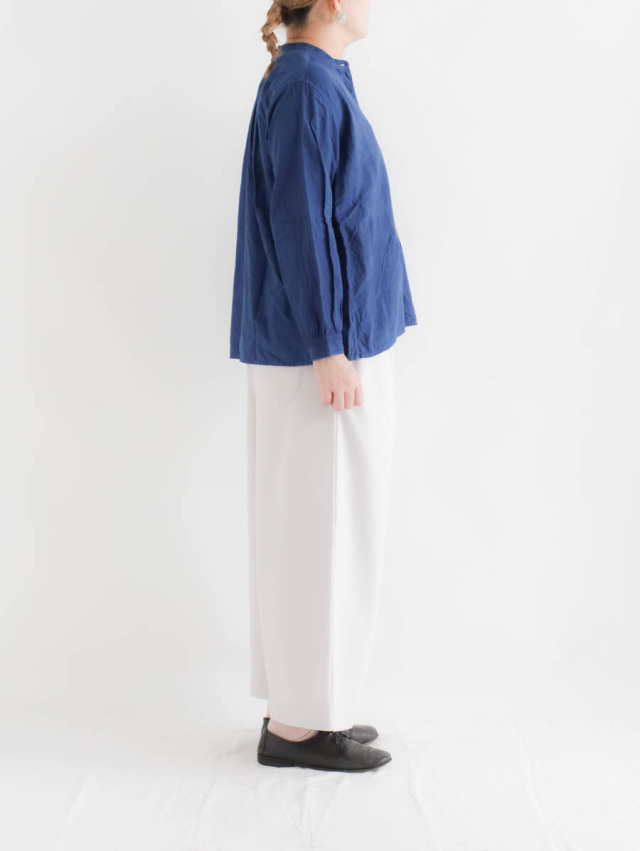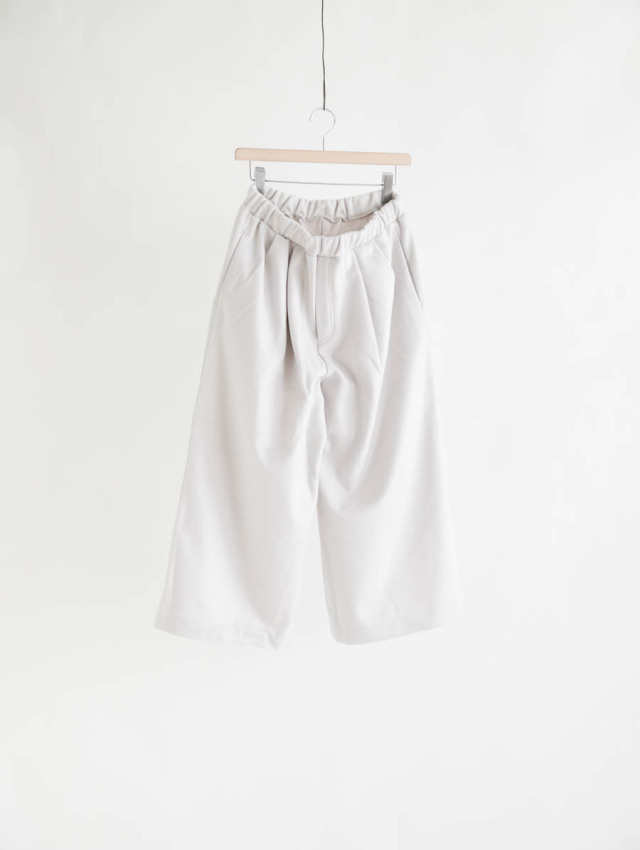 タックを取ることでゆったりとしたラインが出来上がり、自然なドレープ感のあるきれいなシルエットです。ワイドですが生地がしなやかに動くので、見え方はすっきりとした印象です。