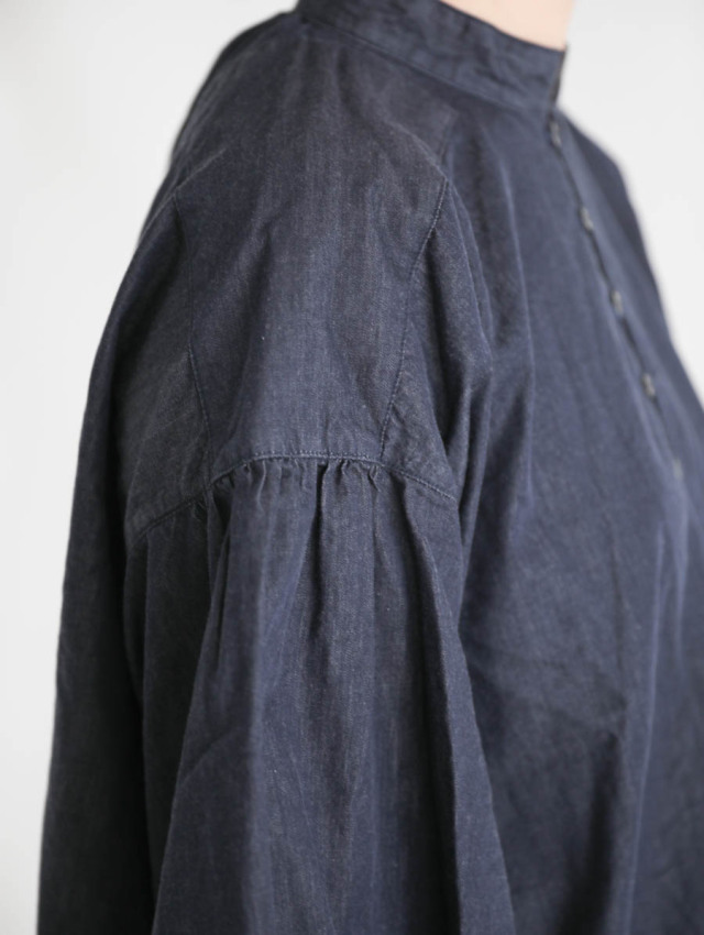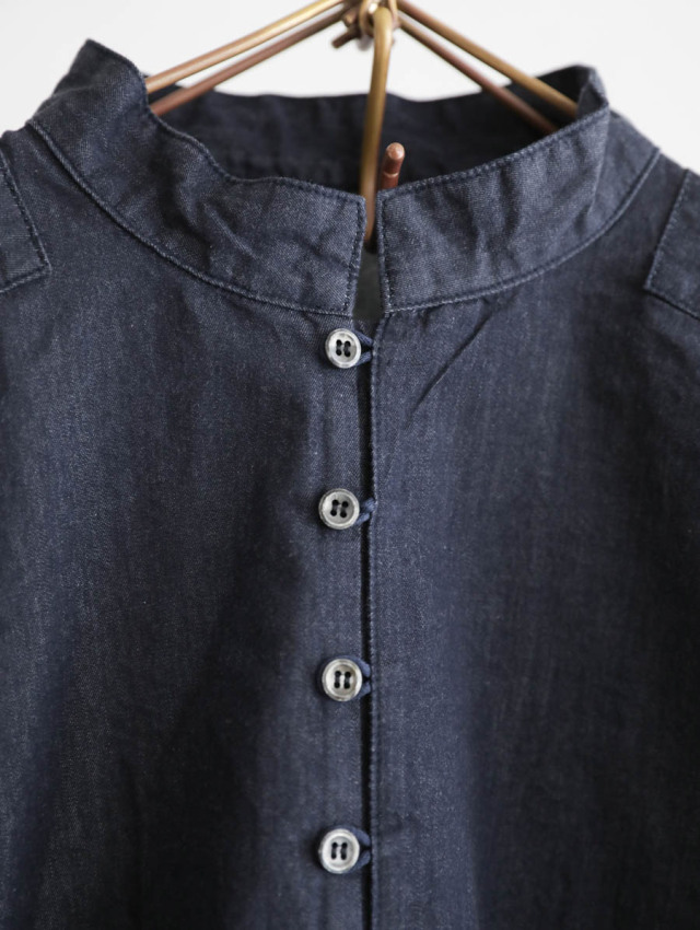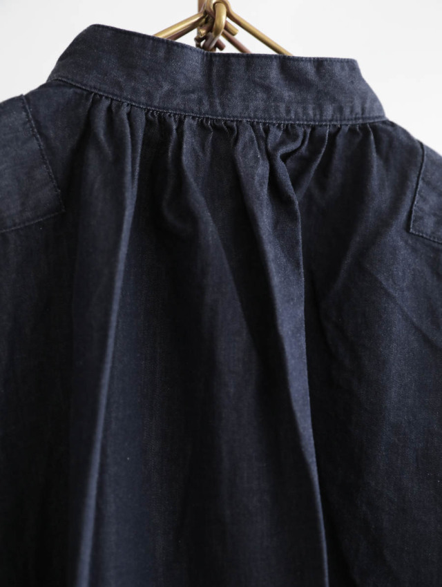 首裏にギャザーの入ったゆったりシルエットのデニムブラウスです。