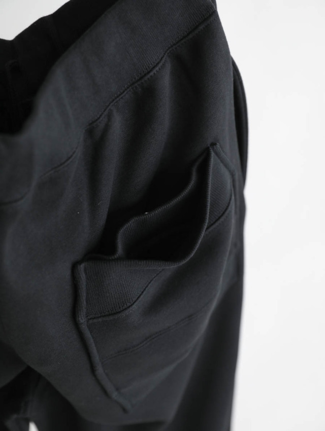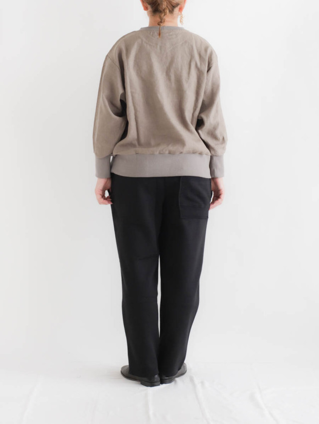 ビッグサイズの裾リブスウェットをリメイク。裾を断ち切って、切り取ったリブ部分をヒップポケットに使用しています。そうするとポケットの形状が樽のようになって可愛らしいアクセントに。ポケットは2層になっていて実用的です。