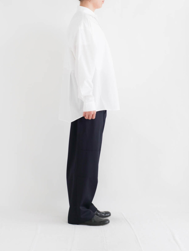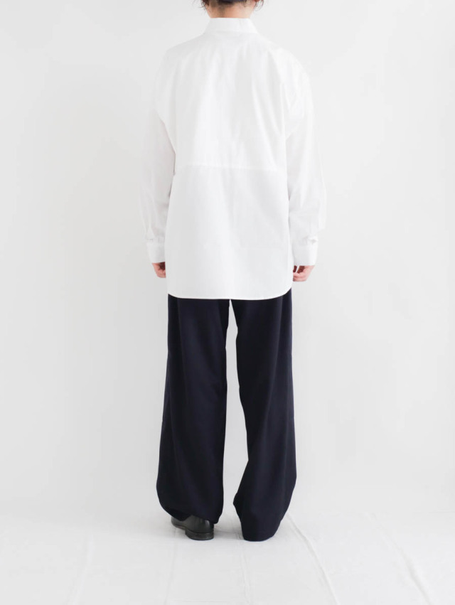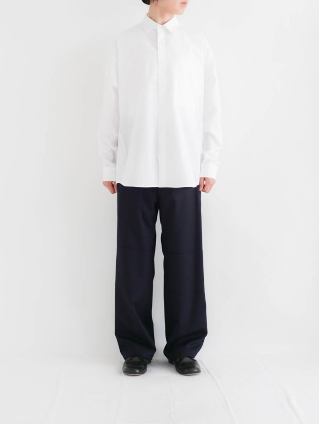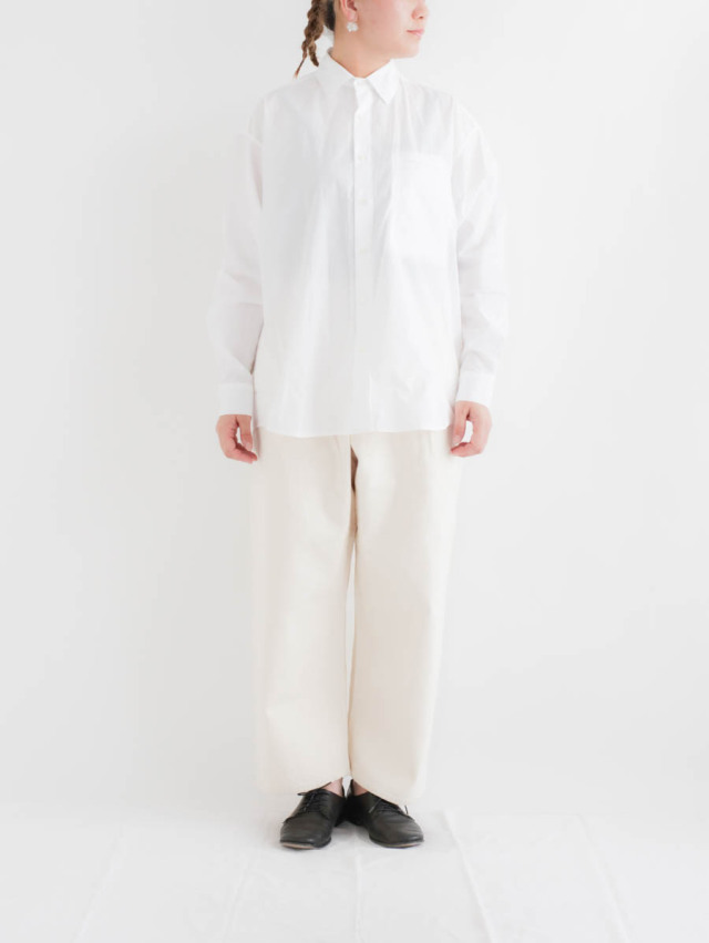 シンプルで使いやすいシャツですので、デニムやチノとのカジュアルな合わせや、スラックスですっきりと見せたり様々に。スウェットパンツなどのイージーパンツと合わせて頂くのもおすすめです。