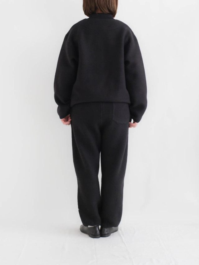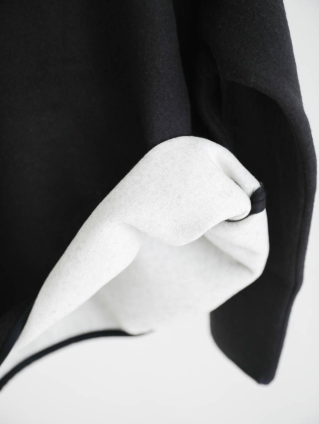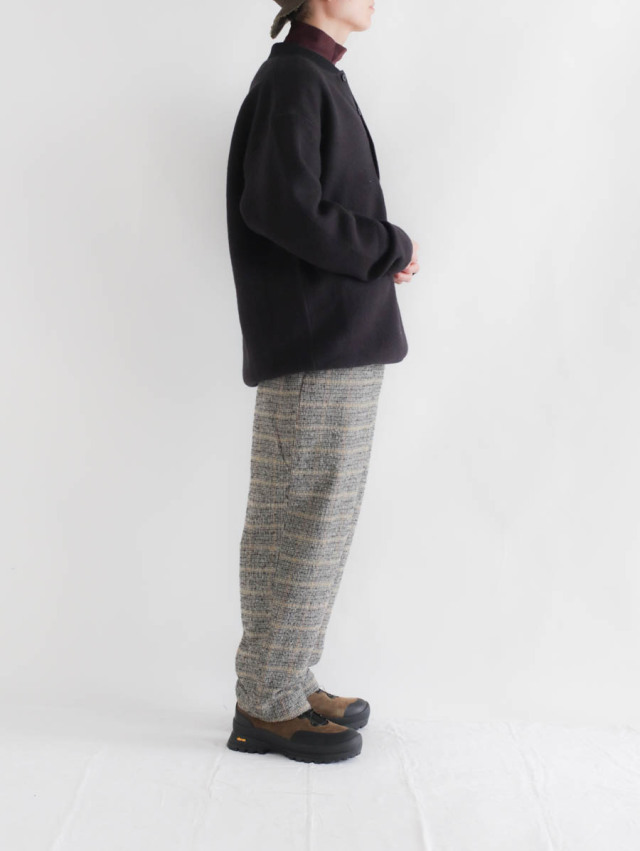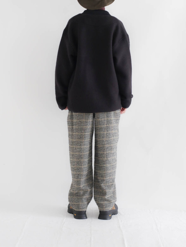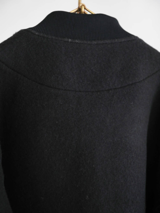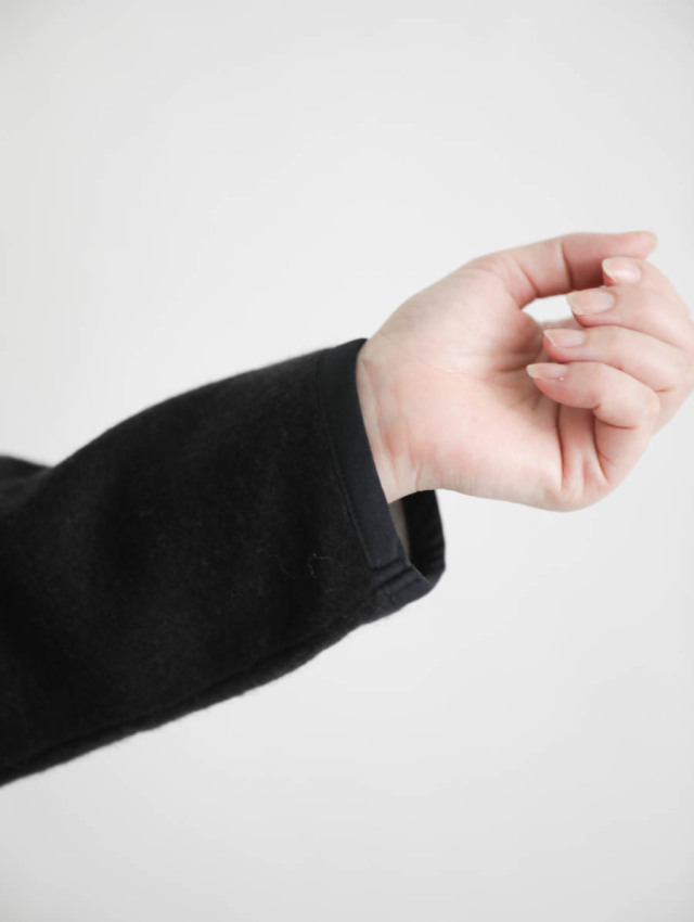 フワッとした肌触りのウールのシープボア、裏側はもちっと肌触りの良いコットンで、保温性があり快適な生地です。イメージは天然素材で作ったフリース。スウェットのように気楽に過ごせて、軽くて温かいです。