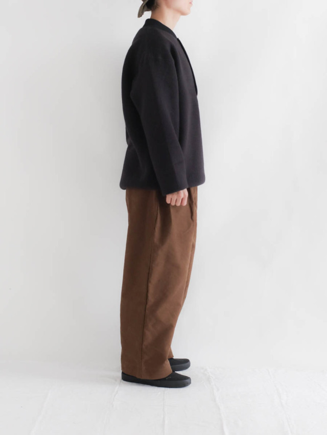 袖口や裾はパイピングで収まり良く、気楽にスタイリングを楽しめる1枚。