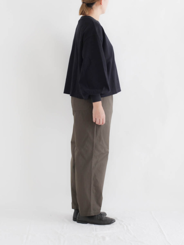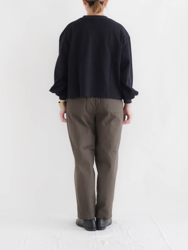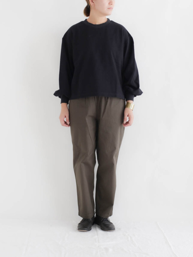ウエストにゴムと紐の通った、楽な穿き心地のイージーパンツ。 ゆったりとしていて、裾にかけてテーパードのかかったきれいなシルエットです。 シンプルで気楽に穿けるので、ニットにカットソー、シャツとトップスも合わせやすいです。