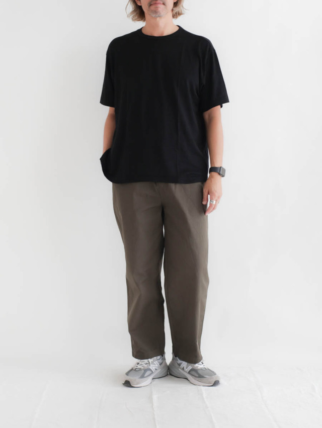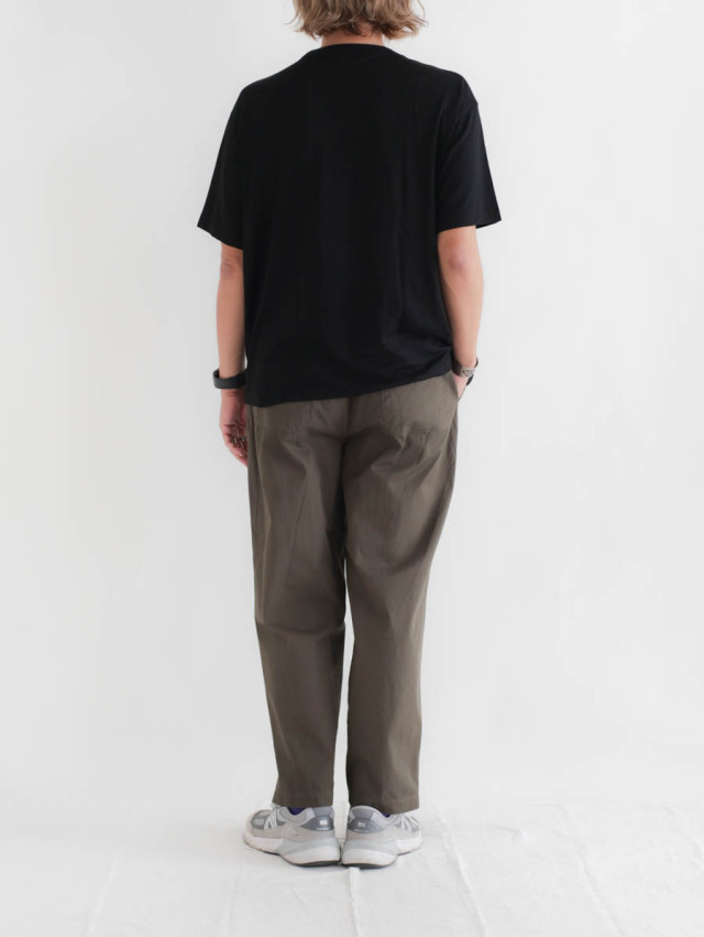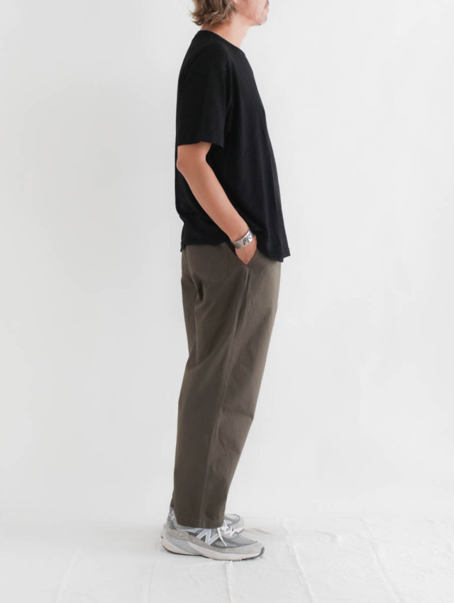 上品とリラックスの絶妙なバランスが魅力の1枚。ラフになりすぎず、大人が気軽に穿くのにちょうどよいパンツです。