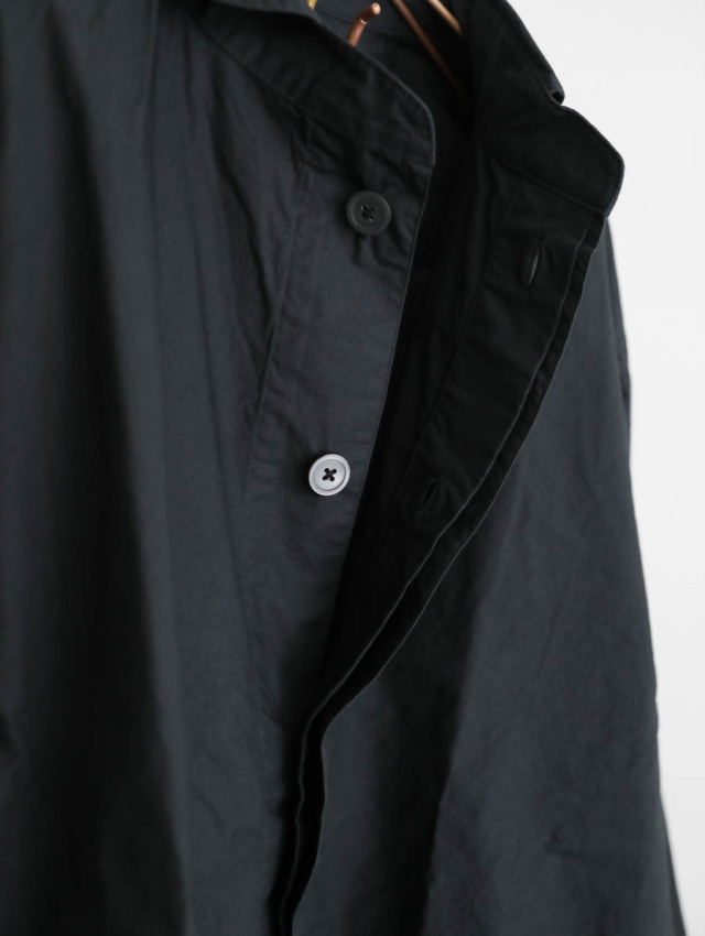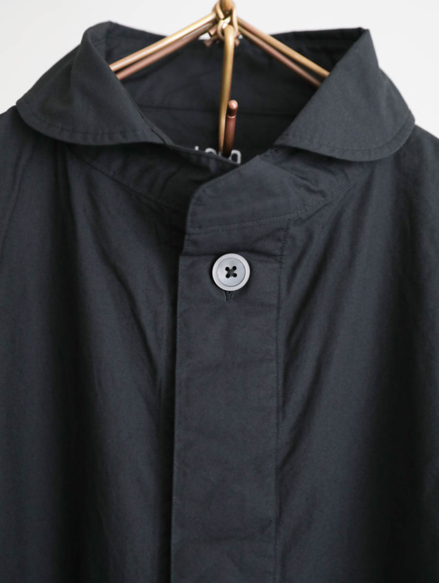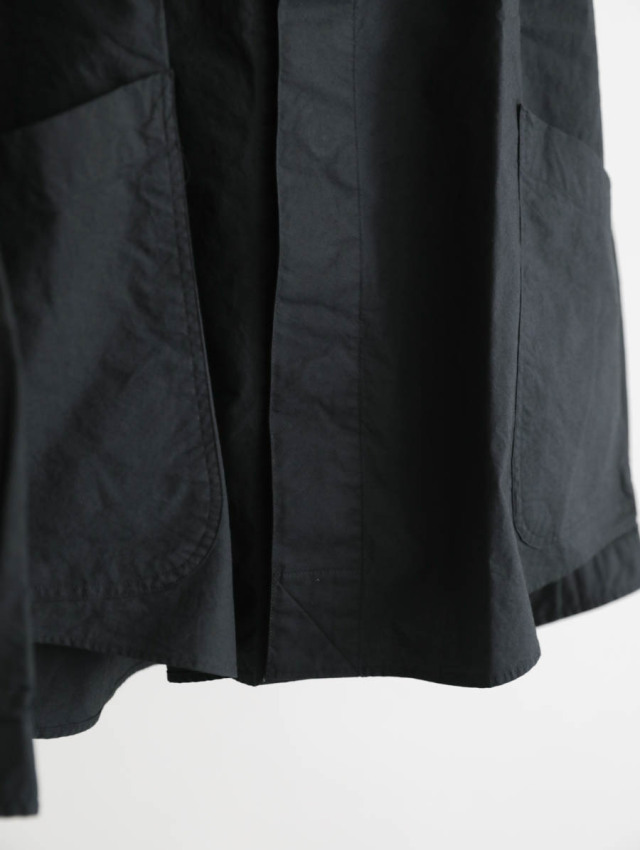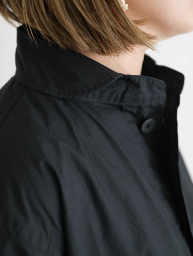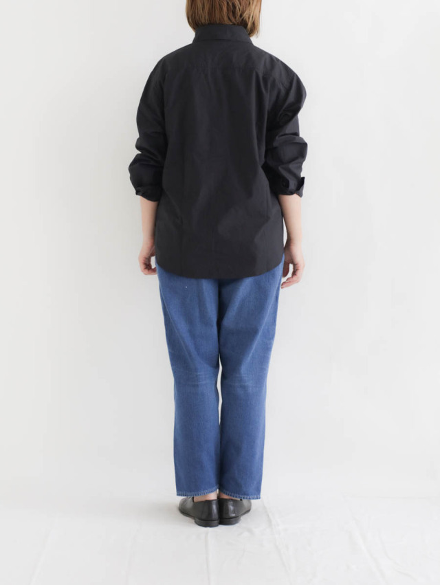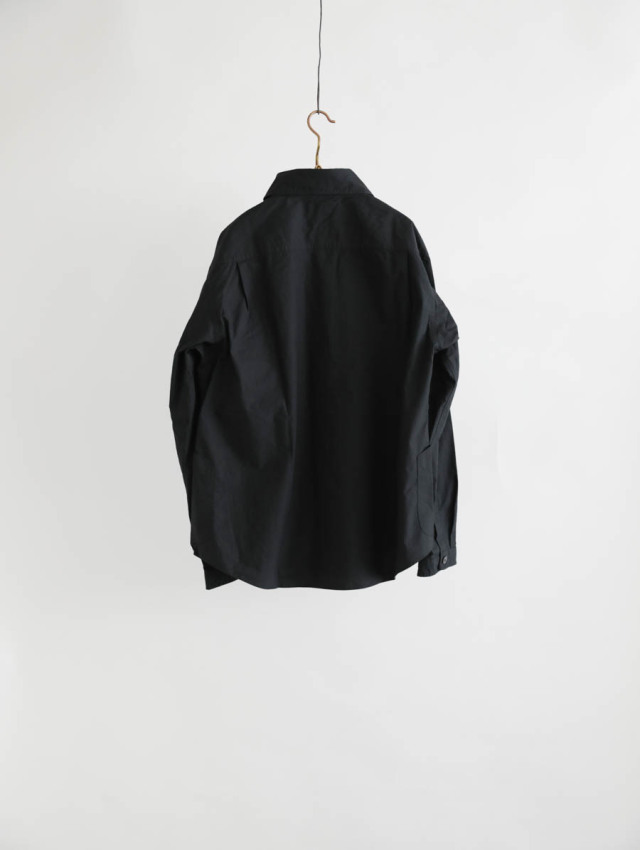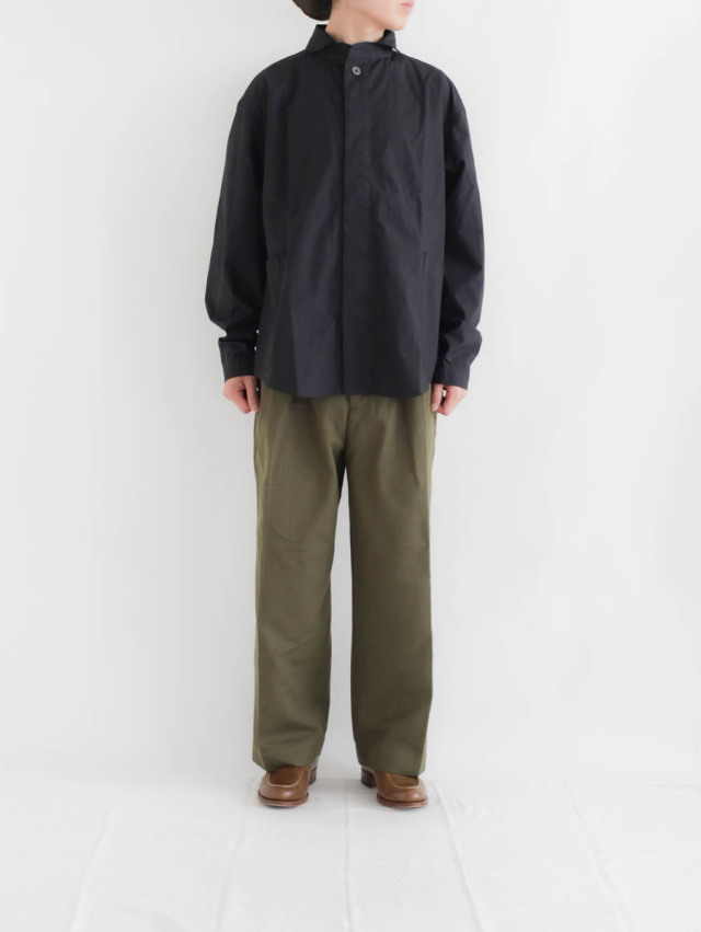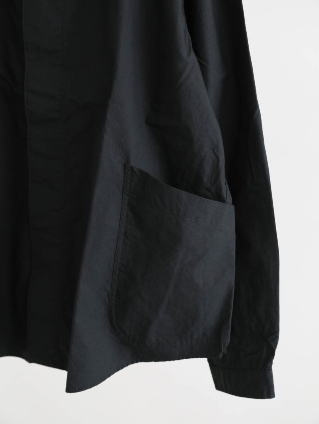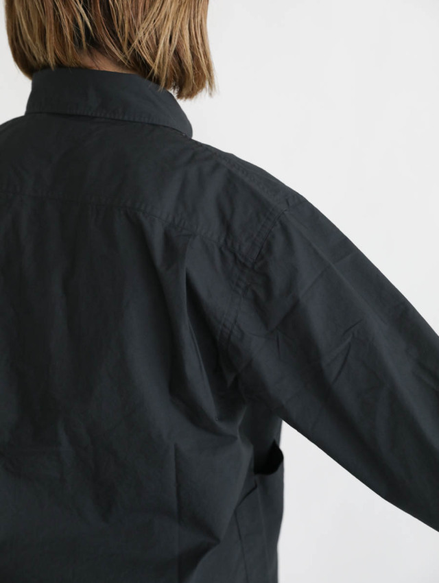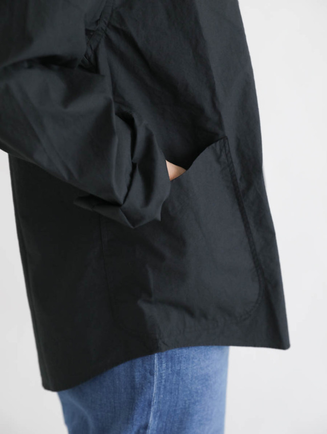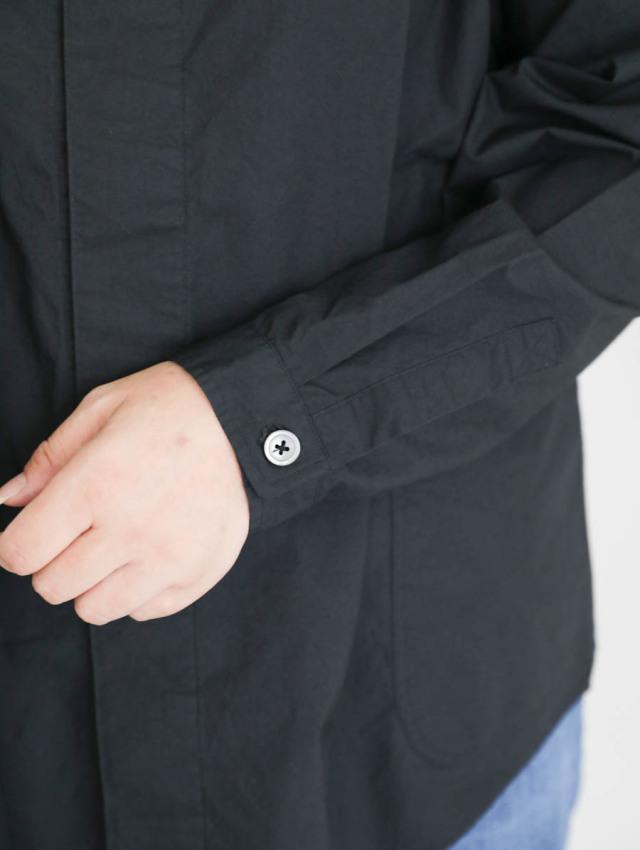 柔らかい印象の丸襟、そして腰の位置に付いたポケットといったプルオーバーシャツの特徴はそのままに。ボタンを表に出さない比翼仕様ですっきりとミニマルな雰囲気に仕上げています。