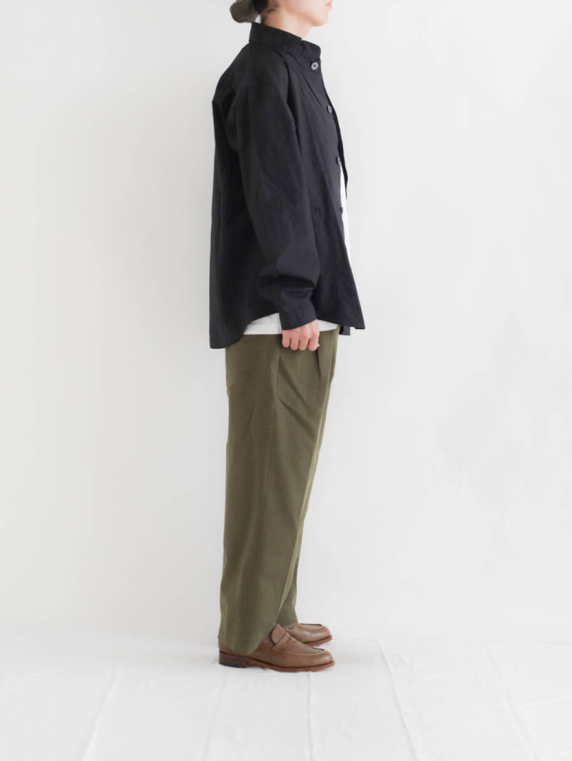 肩幅、身幅に余裕のある楽な着心地。着丈を少しだけ短めにすることで、ルーズに見えないバランスの良いシルエットにしています。