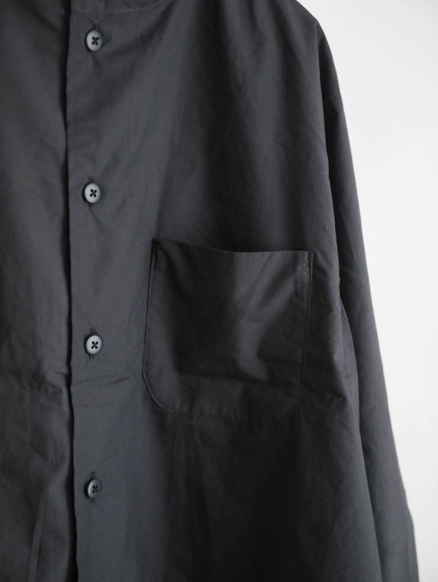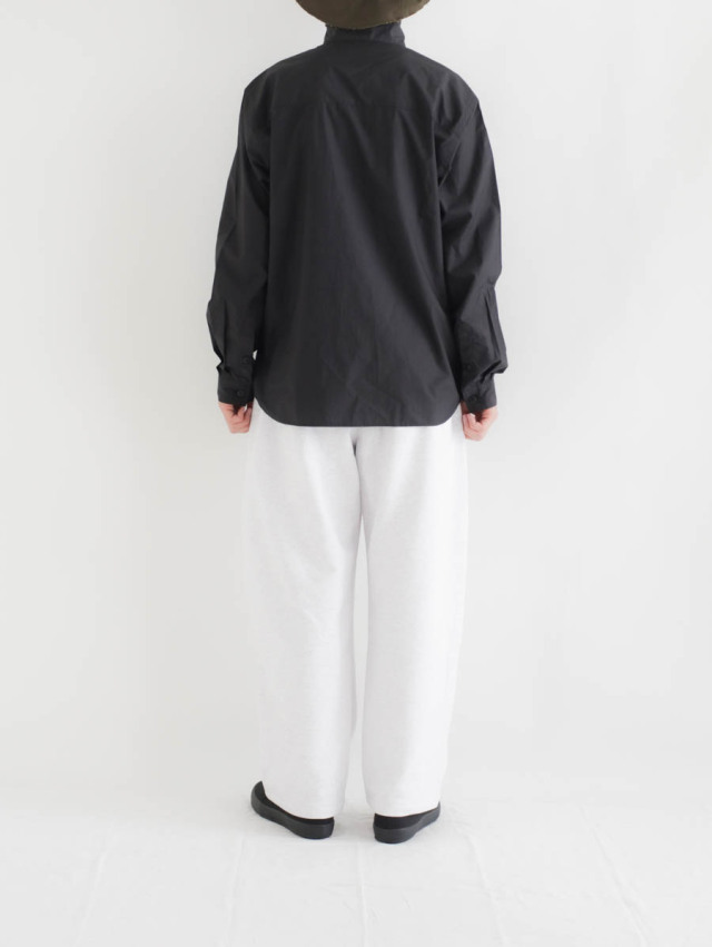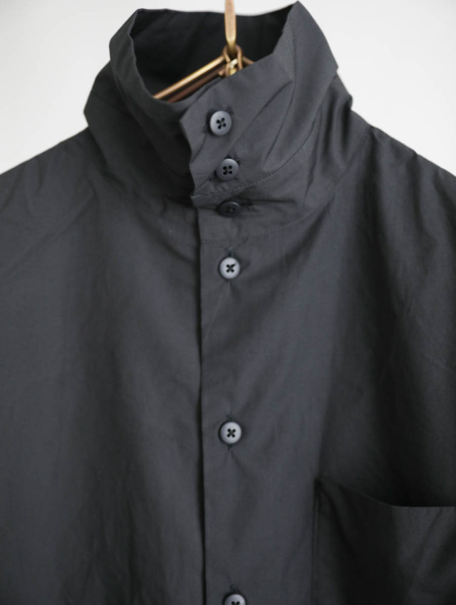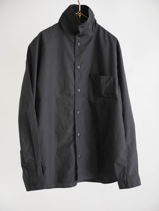 首元を生地が覆うタートルネックのシャツ。程よくゆとりのあるすっきりとしたきれいなシルエットです。高く立ち上がった襟は首元までボタンが付いており、1番上まで留めてタートルとして、1,2個ボタンを外して折り返せば襟のように見せることもできます。