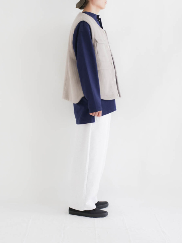 ウエストにはゴムと紐の通ったイージーパンツ。フロントにはタックが入り、外脇を少しカーブさせた曲線的なライン。太さはありつつも、落ち感により収まりの良いきれいなワイドシルエットでご着用いただけます。