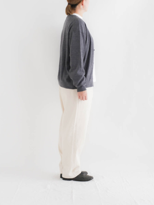 すっきりとしたデザインで、身幅や肩幅にはゆとりのあるサイズ感。着丈は長すぎず、ノーカラーのジャケットのようなイメージで軽く羽織るのも素敵です。